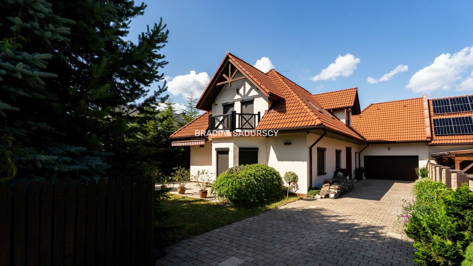 Działka ładnie zagospodarowana, dużo zieleni , obsadzona iglakami, z bramą wjazdową z napędem elektrycznym.