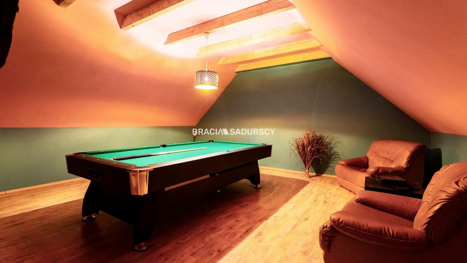 - Pokój bilardowy, usytuowany nad garażem, o powierzchni 39 m2, stanowi kameralne i niezakłócone miejsce do rozrywki i czynnego wypoczynku.